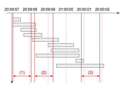 - 설명: 아래 타임라인 그림에서 빨간색으로 표시된 1초 각 구간의 처리량을 구해보면 (1)은 4개, (2)는 7개, (3)는 2개임을 알 수 있다. 따라서 초당 최대 처리량은 7이 되며, 동일한 최대 처리량을 갖는 1초 구간은 여러 개 존재할 수 있으므로 이 문제에서는 구간이 아닌 개수만 출력한다.